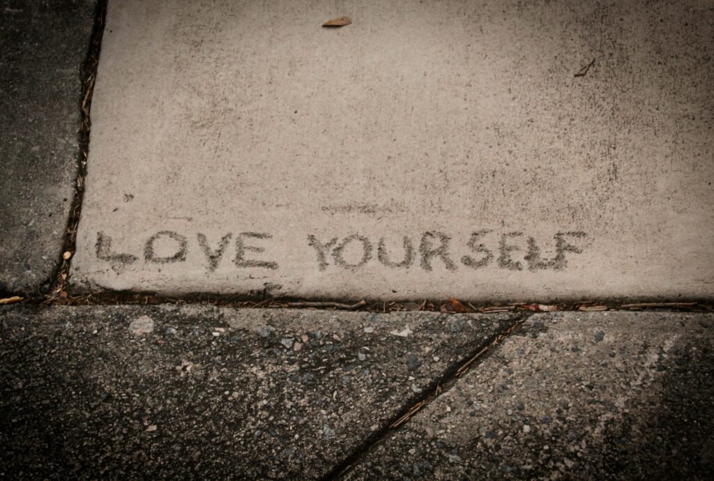 The words ‘Love Yourself’ written on a rough pavement, symbolizing the grounded side of self-love